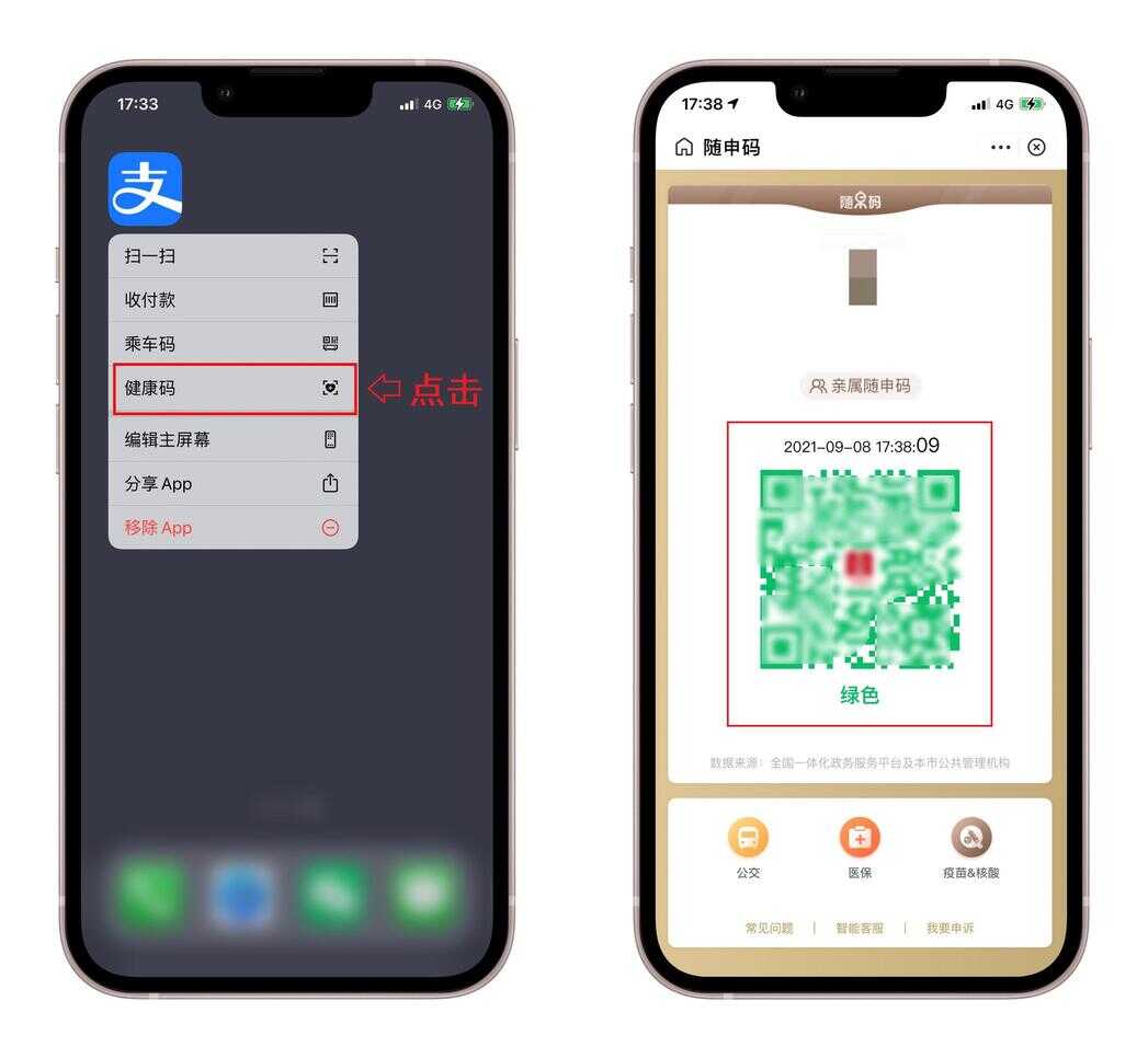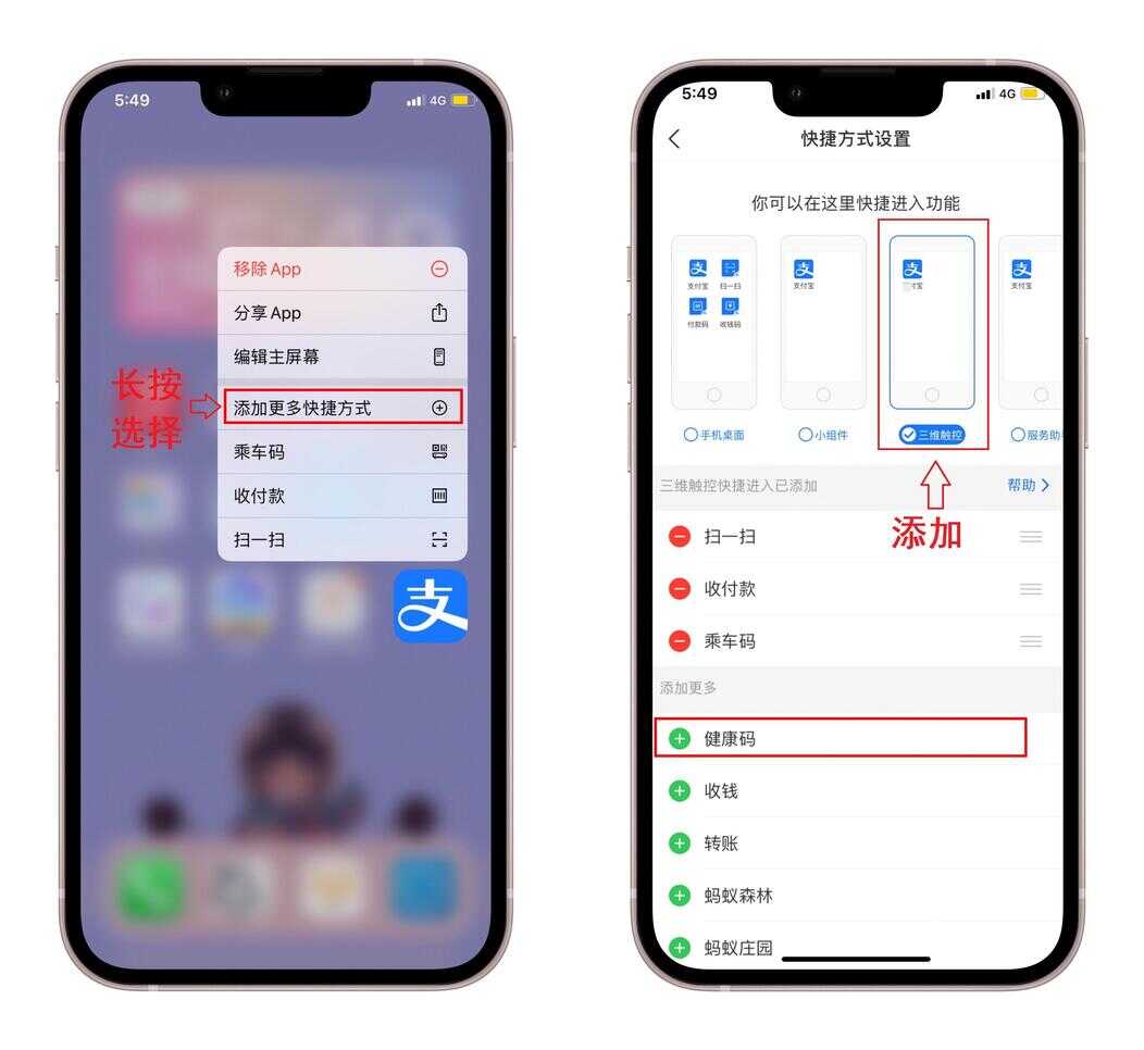 现在出门在外,都要频繁打开健康码,非常麻烦。你可以在桌面找到支付宝图标,长按2秒选择「添加更多快捷方式」,将“健康码”添加到三维触控快捷功能中。