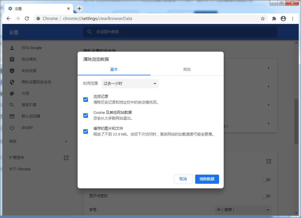 3、单击清除浏览器数据选项,我们可以看到有基本选项和高级选项,我们可以根据需要选择不同的方式来清除缓存。