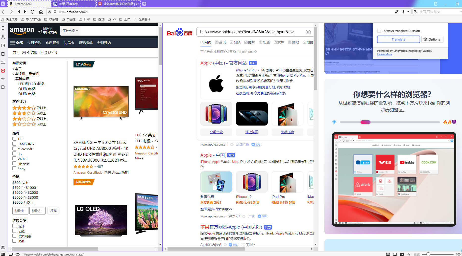 也基于Chromium内核,操作界面非常的简洁。支持换肤功能,还支持系统的黑暗模式。最好用的就是,当用户多选标签后,只需要按住ctrl键然后使用鼠标点选需要选择的标签就可以激活Vivaldi的“页面平铺”功能,这时用户就可以将说选择的标签页进行多种平铺操作。平铺后各标签页可以进行独立的操作。
