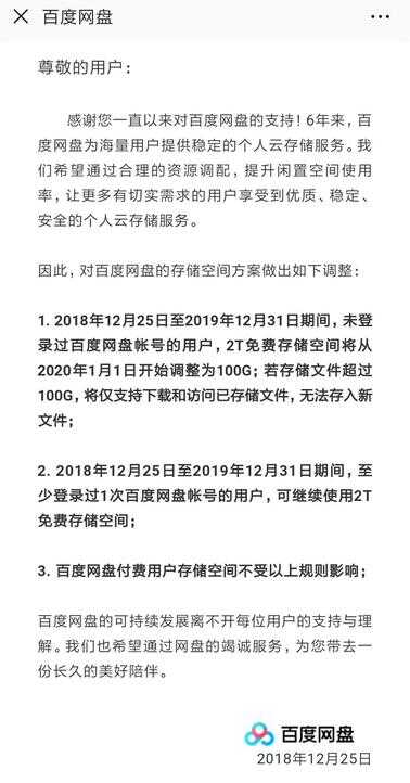 可是今日收到了这样一份百度云盘的通知,对于百度网盘的存储空间要做出调整。据悉将在2018年1月1日12月25日至2019年12月31日期间,未登陆过的百度云盘账号用户,2T免费空间将从2020年1月1日开始调整为100G。