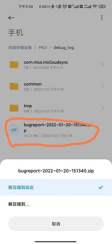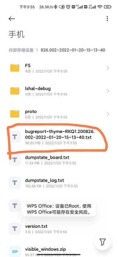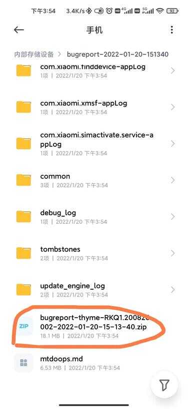 2.生成完毕后打开MIUI/debug_log文件夹,里面的bugreport开头的压缩包就是了,将它解压出来,里面还有一个文件名中有thyme的压缩包,再解压,里面有一个很大的文本文件[bugreport-thyme-]开头的就是,打开后全局搜索“healthd”就能找到了