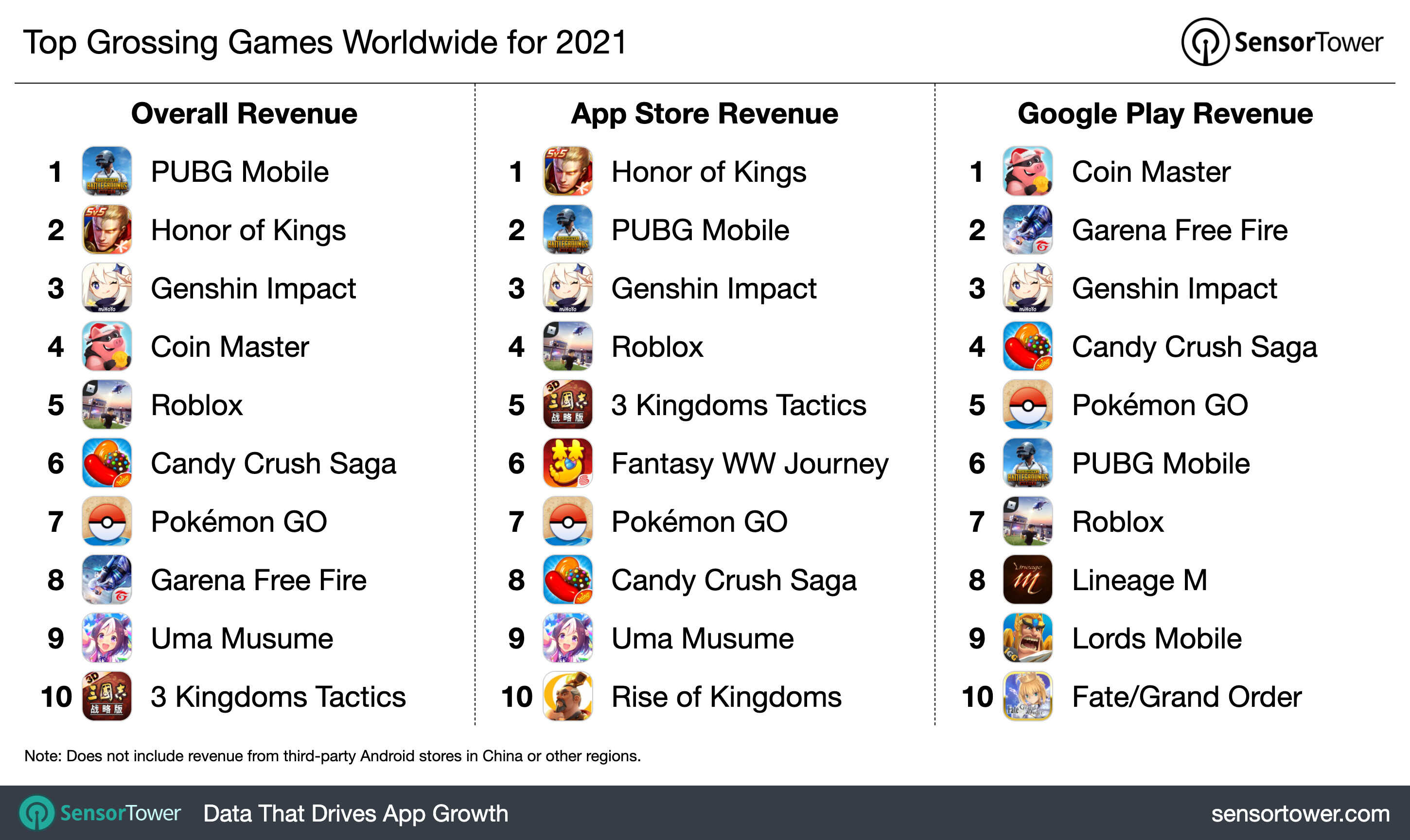 AppStore:前十名分别是《王者荣耀》、《PUBGM》、《原神》、《Roblox》、《三国志·战略版》、《梦幻西游》、《宝可梦GO》、《糖果粉碎传奇》、《赛马娘》、《万国觉醒》