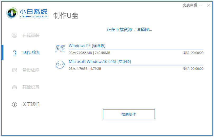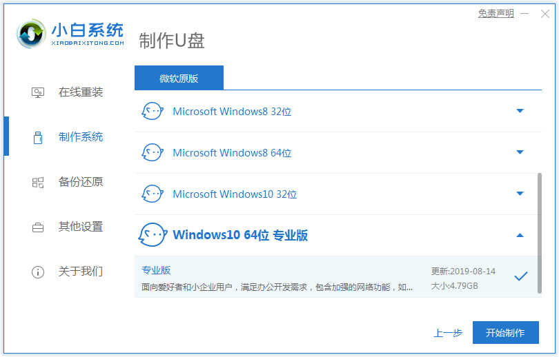 1、 插入U盘到电脑上,打开小白U盘启动盘制作工具,选择“制作系统“,在制作系统中选择制作 U 盘,在选择 U 盘中选择您的 U 盘,其它参数默认,点击开始制作。