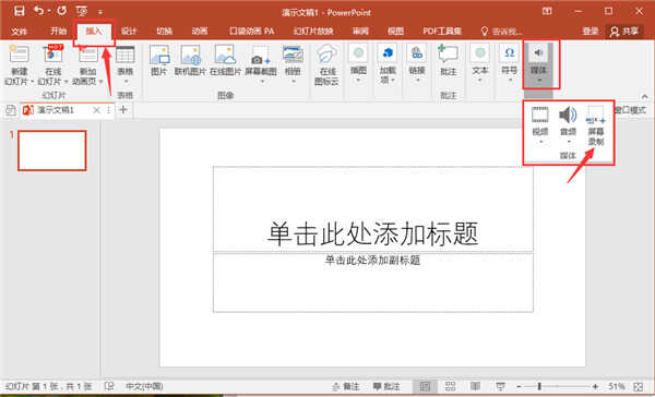 操作方法:点击顶端的【插入】——选择【媒体】——点击【屏幕录制】。
