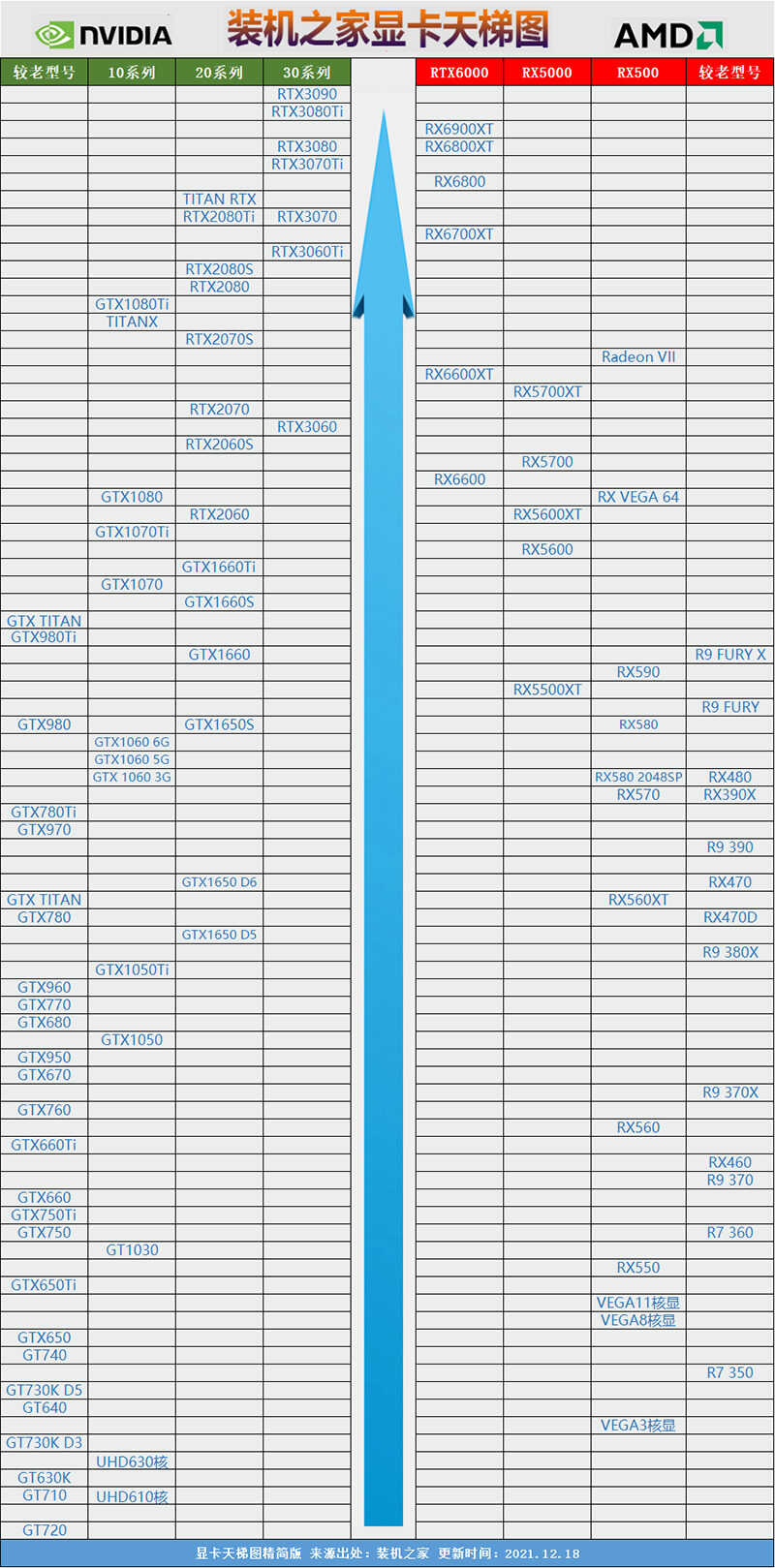 对于3D游戏、3D建模设计之类的需求,主要依赖于显卡的性能,这种情况往往显卡的重要性都高于CPU。在显卡领域中,主流市场一般分别NVIDIA和AMD显卡,也就是我们常说的N卡和A卡,可能在选购显卡的时候,往往会纠结A卡和N卡之间的显卡性能谁更强劲,但是由于不同代不同架构的情况下,难以从显卡参数对比出性能的强弱,除了看显卡评测,我们还可以通过一张“显卡天梯图”更直观的方法来判断显卡型号之间的性能高低,特别适合小白用户。那么怎么区分显卡性能高低?下面装机之家分享一下台式机显卡天梯图2022年1月最新版。