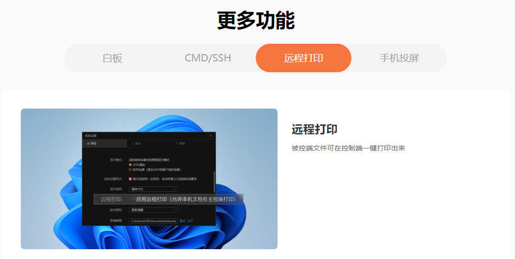 另外,还有“远程打印”、“手机投屏”、“聊天”、“录像”、“截屏”、“分辨率”调节等多种特色功能,满足我们不同远控操作使用,提升了远程交互体验。