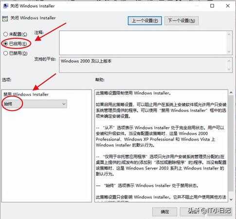3、上面点选“已启用”,下面选择“始终”,应用》确定。