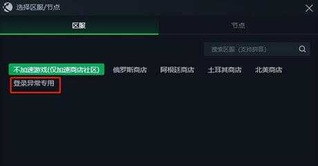 此外,还有很多玩家在登录时会遇到提示“Steam在连接至服务器时遇到问题”等登录异常或者登录困难等问题,大家可以在加速器选择区服位置处选择“登录异常专用“节点进行加速,可以有效解决以上登录报错问题。