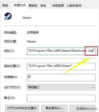 有一种解决方法就是添加 -tcp,可能很多小伙伴不知道是什么意思,大家只需要按照步骤操作就可以了非常简单,右击我们的steam,点击到属性,然后在点到第二栏,就是快捷方式中,在目标栏里面添加 -tcp,不过要注意的是注意-tcp前方有个空格。然后再点击确定。