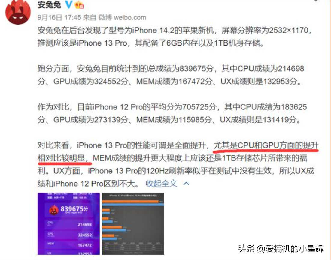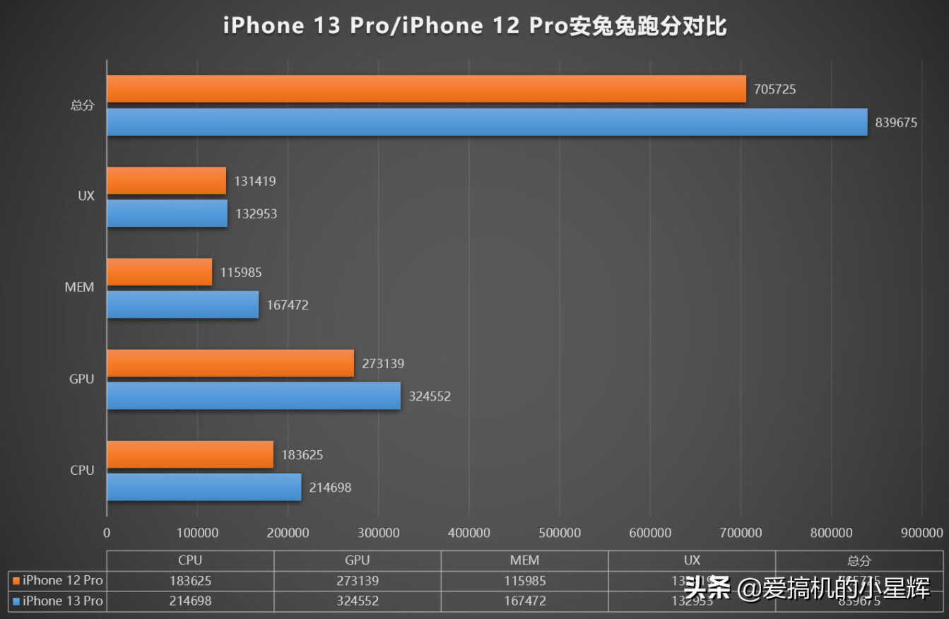 从以下对比图我们可以看到,iPhone 12 Pro的安兔兔跑分在70万左右,其中CPU跑分为18.36万,GPU跑分为27.31万,MEM跑分为11.59万,从安兔兔公布跑分可以推测出,A15芯片相比A14芯片,CPU大约提升了17%,GPU大约提升了19%,MEM大约提升了44%,整体性能大约提升了18%,也就是说,这次iPhone 13 Pro和上代在性能上还是有比较明显的提升,并非“挤牙膏”式升级。