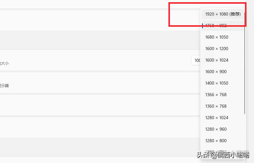 3、如果当前分辨率不是推荐选项,点击分辨率,会出现若干选项(见下图)选择带“推荐”字样分辨率,即可解决显示器两侧黑屏问题。