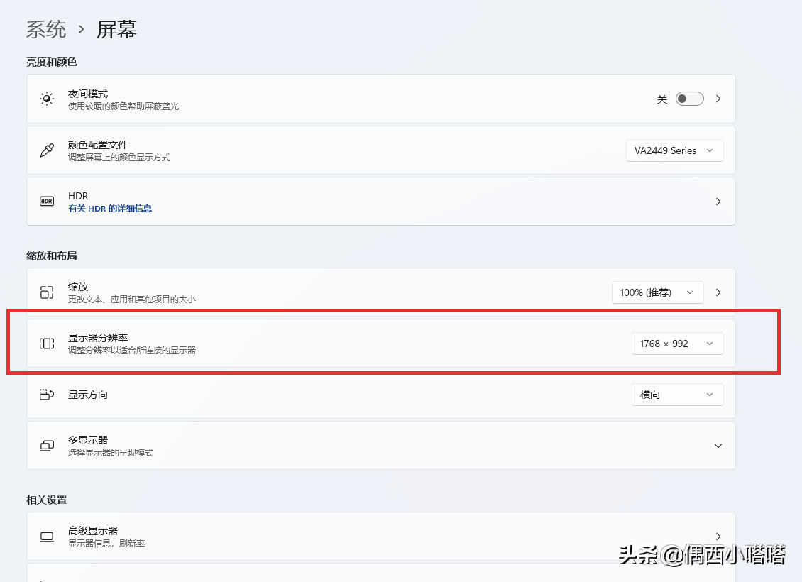 2、点击显示设置后,在缩放与布局模块里找到“显示器分辨率”,可以参考下图,点击查看当前的分辨率是不是系统推荐的最佳分辨率设置选项: