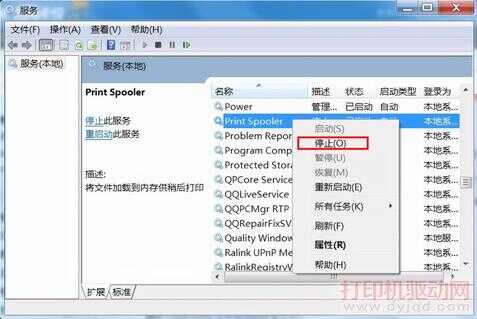 ②、然后在本地服务中找到“Print Spooler”服务,右键点击选“停止”(先不要关闭服务窗口哦,下面还会用到);