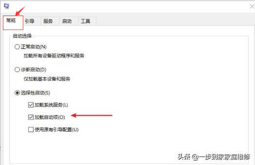 5、输入msconfig后,在常规选项下,取消勾选加载启动项。