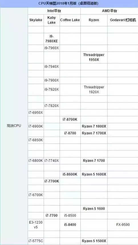 对于2018年新装机的电脑朋友来说,Intel全新八代酷睿和AMD锐利系列处理器无疑是首选,买新不买旧,依然是新装机的主流旋律。以下是桌面电脑CPU天梯图2018年1月最新精简版。