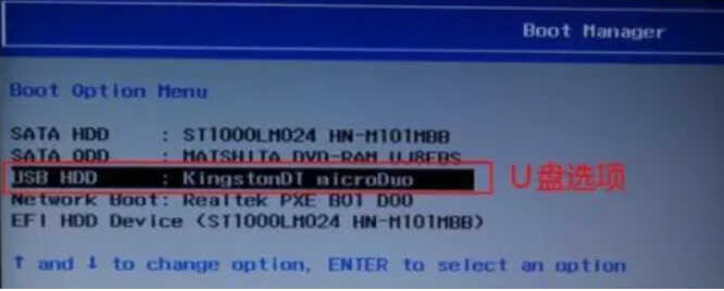 3、在启动项选择菜单界面下,选择usb项,按回车键即可进入U盘重装页面。