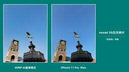 参考iPhone 11 Pro Max的成片,两部手机在白平衡的理解上比较接近。对比放大之后的细节,nova6 5G的细节会更丰富一些,4000万像素的超清模式最大的优势就是在解析力上。