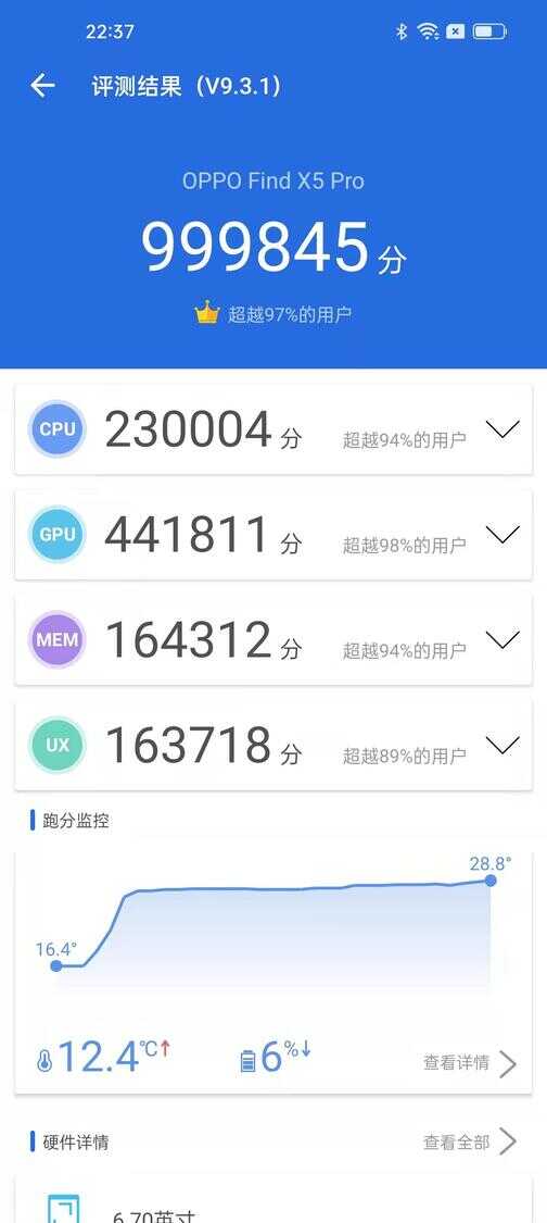 在安兔兔跑分测试中,我手上的这台OPPO Find X5 Pro跑到了999845分,在30分钟的原神测试中(画质为高、帧率为60),在前15分钟它能够稳定在50帧左右,不过在20分钟左右,游戏的帧率和画面分辨率就大幅下滑,只能说整体符合今年骁龙8Gen 1的水准,不过在发热情况确实要比去年的骁龙888强上一大截,起码没那么烫手。