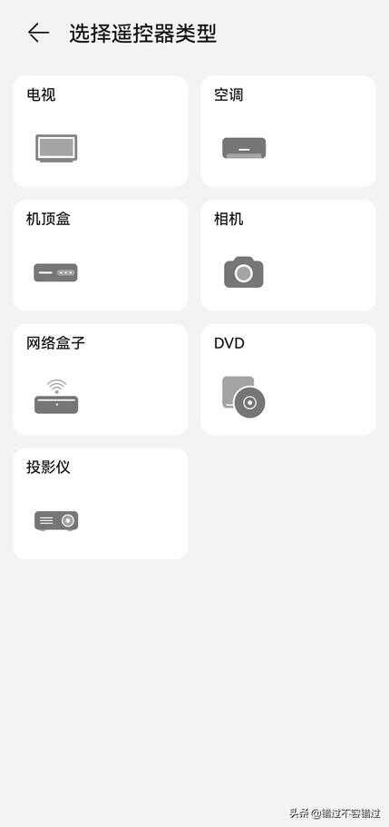 选择要添加的遥控器类型,有七个类型可以选:电视、空调、机顶盒、相机、网络盒子、DVD、投影仪