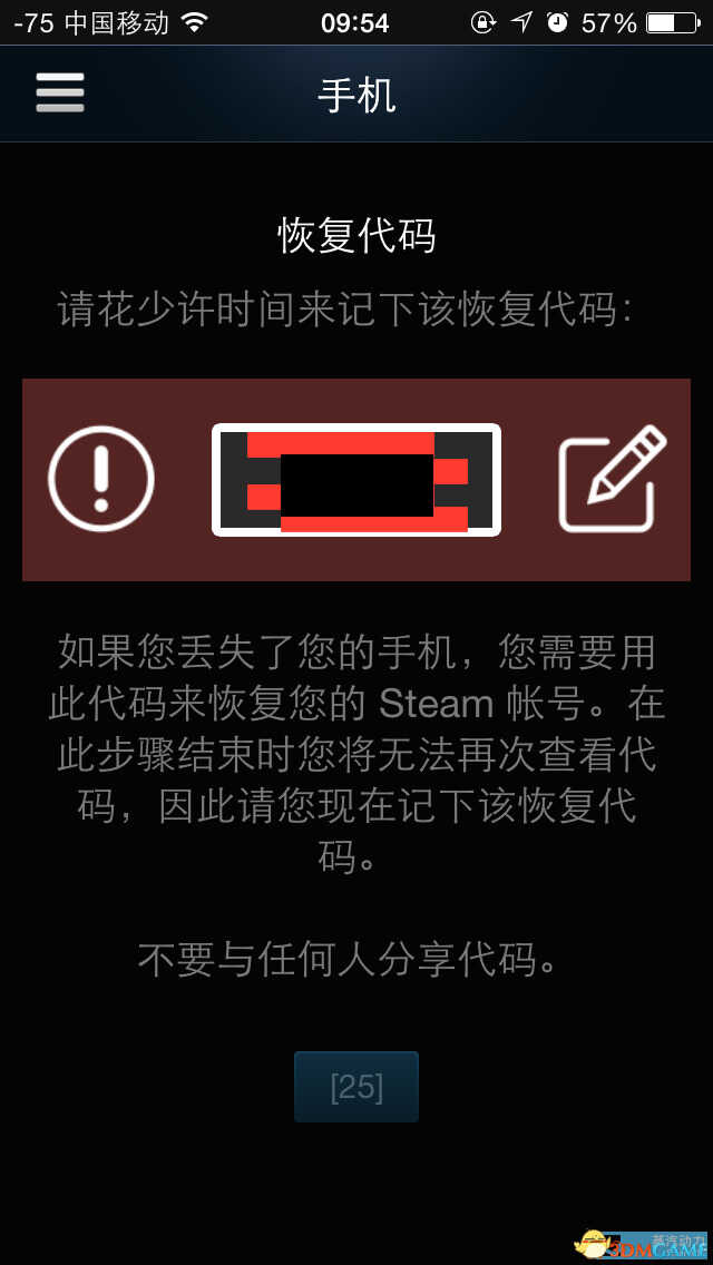 10、我们还需要在手机页面恢复一下自己的代码,以防手机丢失,可以使用这个代码找回steam账号。