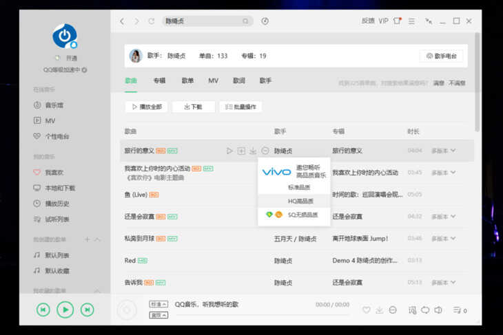 第六步:搜索自己喜欢的歌曲,点击歌曲名右侧的下载按钮,选择自己想要的品质。