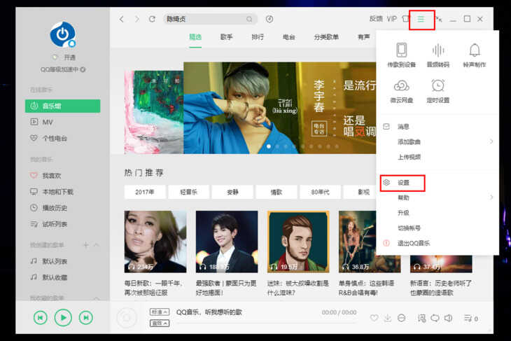第三步:从QQ音乐主界面的右上角“菜单”(图中红框)找到“设置”子菜单(图中红框),点击进入。