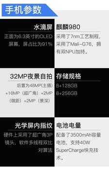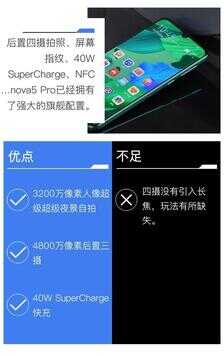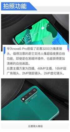 首先,我们先简单看下nova5 Pro的参数,nova5 Pro采用了一块OLED屏幕,屏占比高达91%;在nova拿手的自拍上,nova5 Pro的采用了目前华为最强的前摄配置——f/2.0光圈的3200万像素前摄镜头,后置镜头则进一步升级为后置四摄;性能上则采用了目前华为最强的麒麟980处理器,综合来看性能十分强大。
