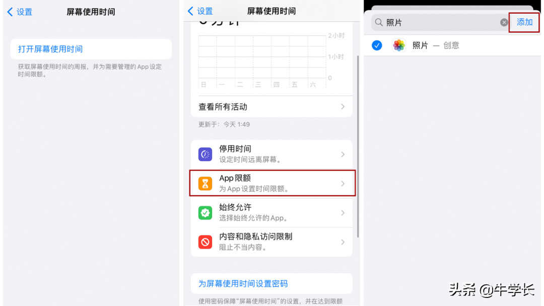 再回到【打开屏幕使用时间】界面,再找到“App限额”,点击“添加限额”,可直接搜索【照片】并勾选,再点击右上角的“添加”。