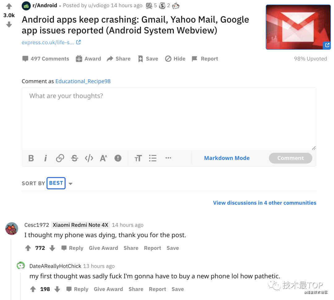昨天,外媒 9to5 Google 报道,在晚7-10点的几个小时里,大量的用户都遇到了一些安卓应用连续闪退的情况,在用户尝试打开APP的时候,会弹出一个“Keep closing”的警告框,处于后台且当前未打开的应用程序也会受到影响。中招的APP中,有包括Google Gmail、Yahoo Mail和Amazon shopping等一些顶流APP。从Gmail的崩溃报告中可以看出,从7点后,APP崩溃成指数级上升。