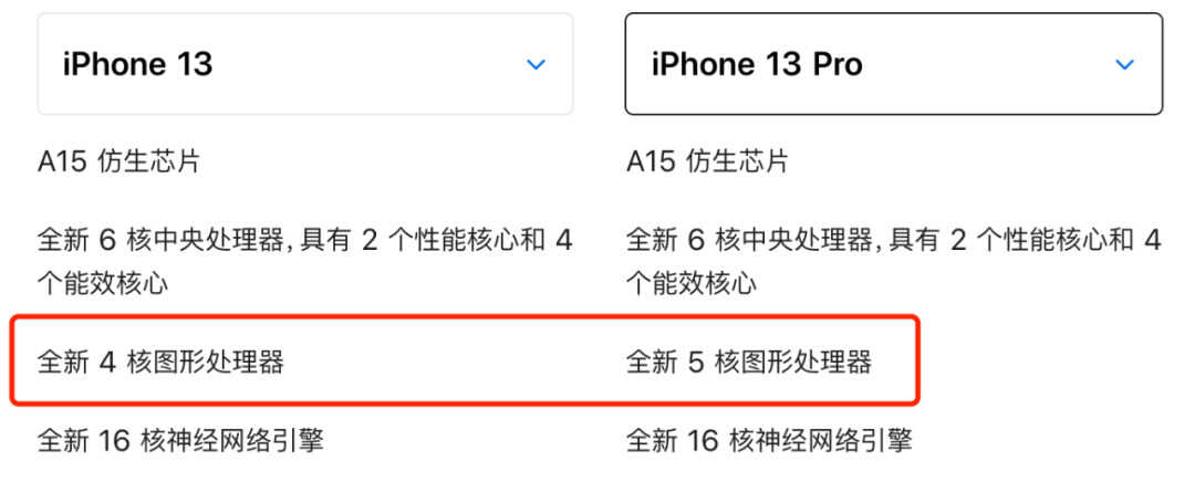 iPhone 13和13mini搭载的是4核GPU,而13 Pro和13 Pro Max则是5核GPU。