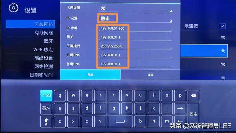 3、通过遥控器中的上,下,左,右按钮勾选“显示高级选项”进入下面界面,然后向下移动到IP设置选项—选择静态后会多出相关参数设置—IP地址栏中填写自家路由的IP网段—在这里选用192.168.31.200,然后依次填写网关、子网掩码、主备DNS等参数。如果您还不清楚家里的IP网段是什么?请在评论区留言,我看到后会一一回复。