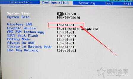 笔记本电脑开机后,反复按下F2键或者DEL键进入主板BIOS。在Advanced选项卡、security选项卡或Configuration选项卡下有无线网卡的开启关闭选项,BIOS下无线网卡选项具体有4种描述方式:Wireless、Wireless LAN、Wireless LAN Support、WLAN Device。将其设置一下“Enabled”(启用)的状态,记得按F10保存并退出。如果默认是开启的,可以先关闭,开机进一下系统,再重启进入BIOS打开该无线网卡选项。