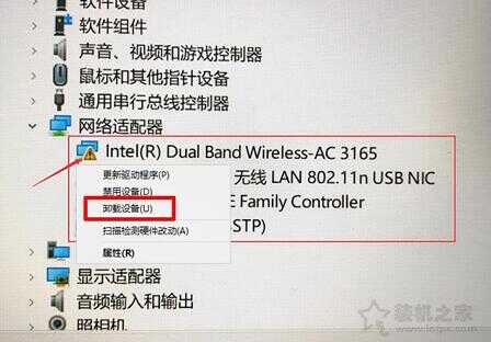 具体方法:鼠标右键“此电脑”,选择“管理”,点击左侧栏的“设备管理器”,在网络适配器中找到感叹号的无线网络设备,右键选择“卸载设备”,并勾选删除此设备的驱动程序,卸载后重启电脑即可,一般会自动安装无线网卡驱动,看看是不是可以上网了,无线网卡驱动如果不自动安装,可以使用有线网络使用驱动精灵、驱动人生、鲁大师进行重装无线网卡驱动。