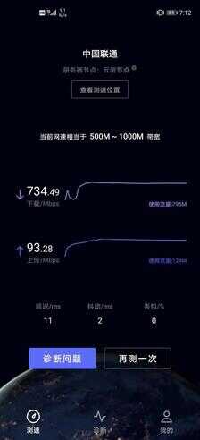 使用华为官方出品的“一键测速”(在华为应用商城搜索“一键测速”,即可下载使用),5G速率实测结果为:下载速率为734.49Mbps,上传速率达到了93.28Mbps,这个成绩符合联通5G套餐的网速。而这样的5G网络速度是大幅度优于4G网络的。