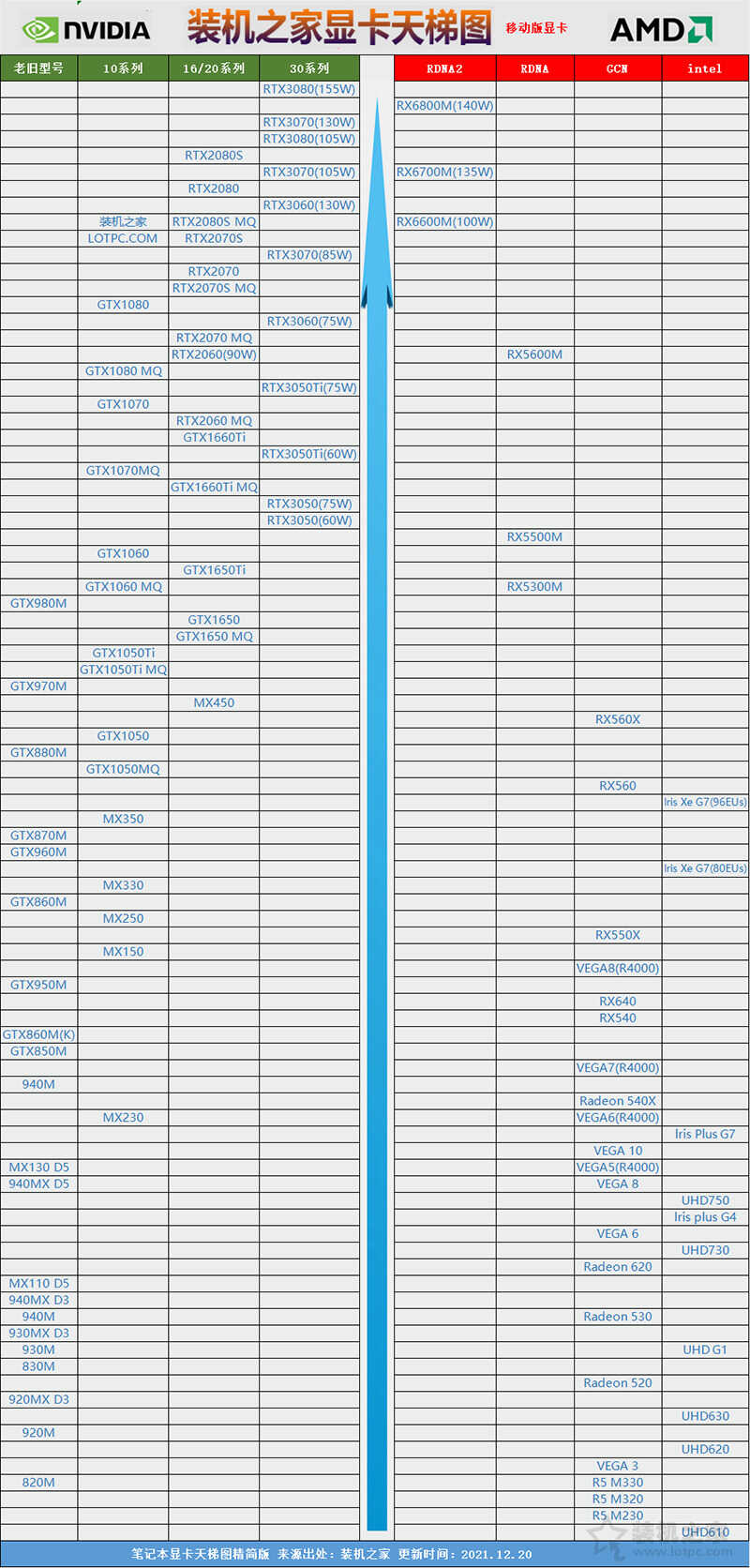 笔记本移动版显卡天梯图中能够明显看出,移动版显卡基本是NVIDIA占据了较大市场,N卡型号繁多,同时从入门到高端可选性较多,总体来说AMD的显卡目前在移动端还是处于十分弱势的地位,主要也是因为AMD显卡能耗比很差,不过也有例外,在苹果的笔记本或者一体机上一直采用AMD显卡。当然我们期待AMD能够在笔记本显卡领域做的更好,就像搭载AMD CPU的笔记本一样,功耗、性能表现不错的情况下,可以为消费者更多的实惠,就看AMD RDNA2架构的Radeon RX 6000M系列移动版显卡后期表现了,废话不多说,来看看本期的笔记本显卡天梯图2021年6月最新版。