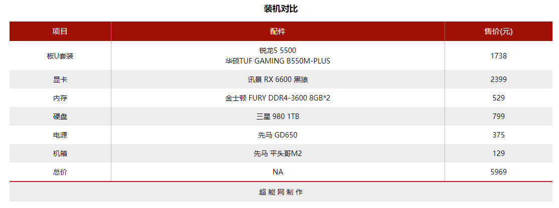 锐龙5 5500的另一个优势就是它的价格了,目前Intel并没有千元价位的6核处理器,售价1099元的锐龙5 5500整合卡在酷睿i5和酷睿i3价格段中间,这处理器仅支持PCI-E 3.0,你现在根本不用烦B450不支持PCI-E 4.0的问题,想要便宜主板的话直接上B450就好了,当然想要获得较好扩展性能的话还是搭B550主板更好,我们放出一个装机配置供大家参考。