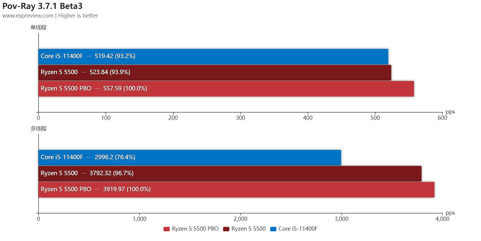 POV-Ray是由Persistence OF Vision Development开发小组编写的一款使用光线跟踪绘制三维图像的渲染软件,其主要作用是利用处理器生成含有光线追踪效果的图像帧,软件内置了Benchmark程序。锐龙5 5500不论在单线程还是多线程测试里都要强于酷睿i5-11400F。