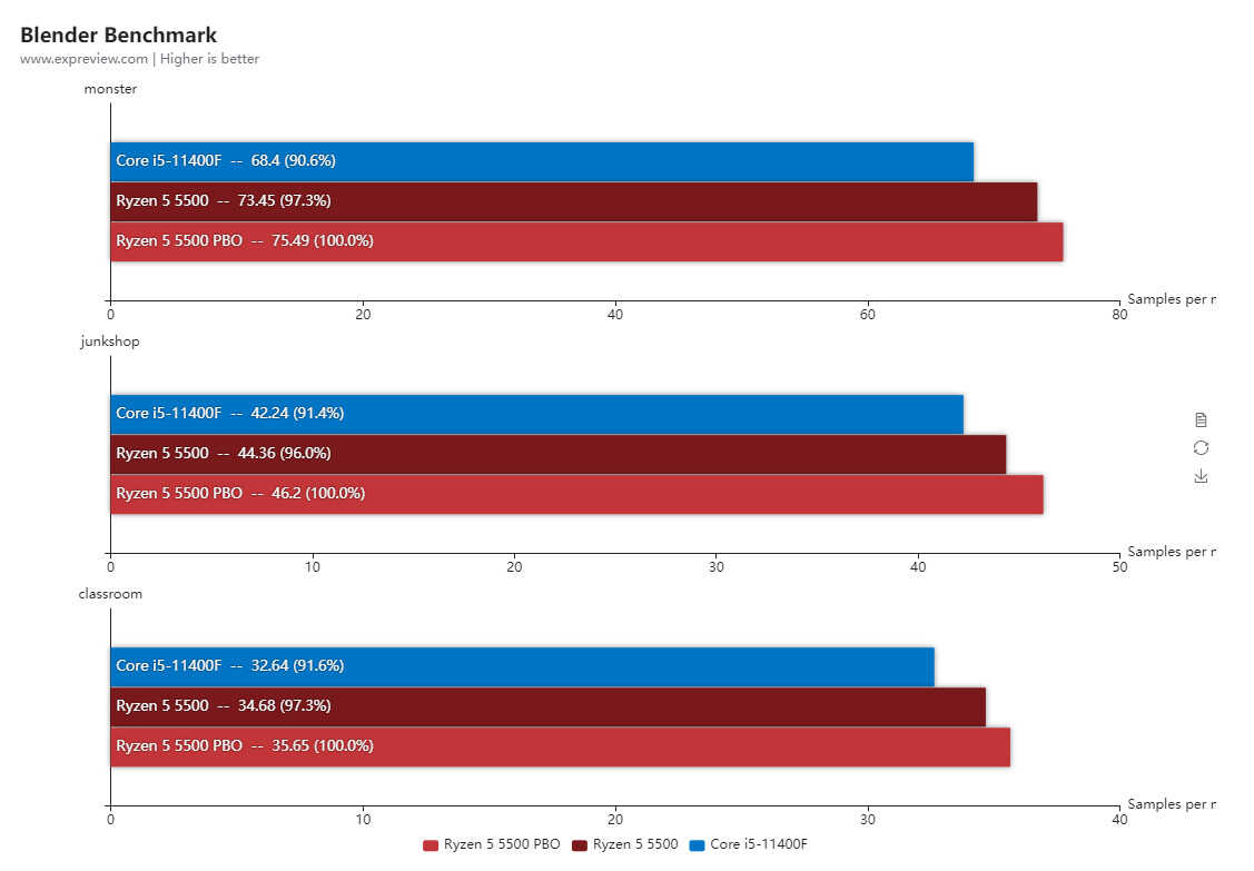 Blender是一个开源的多平台轻量级全能三维动画制作软件,提供从建模,雕刻,绑定,粒子,动力学,动画,交互,材质,渲染,音频处理,视频剪辑以及运动跟踪,后期合成等等的一系列动画短片制作解决方案,测试使用官方最新的Benchmark工具,锐龙5 5500在三个测试场景里渲染能力都要优于酷睿i5-11400F。