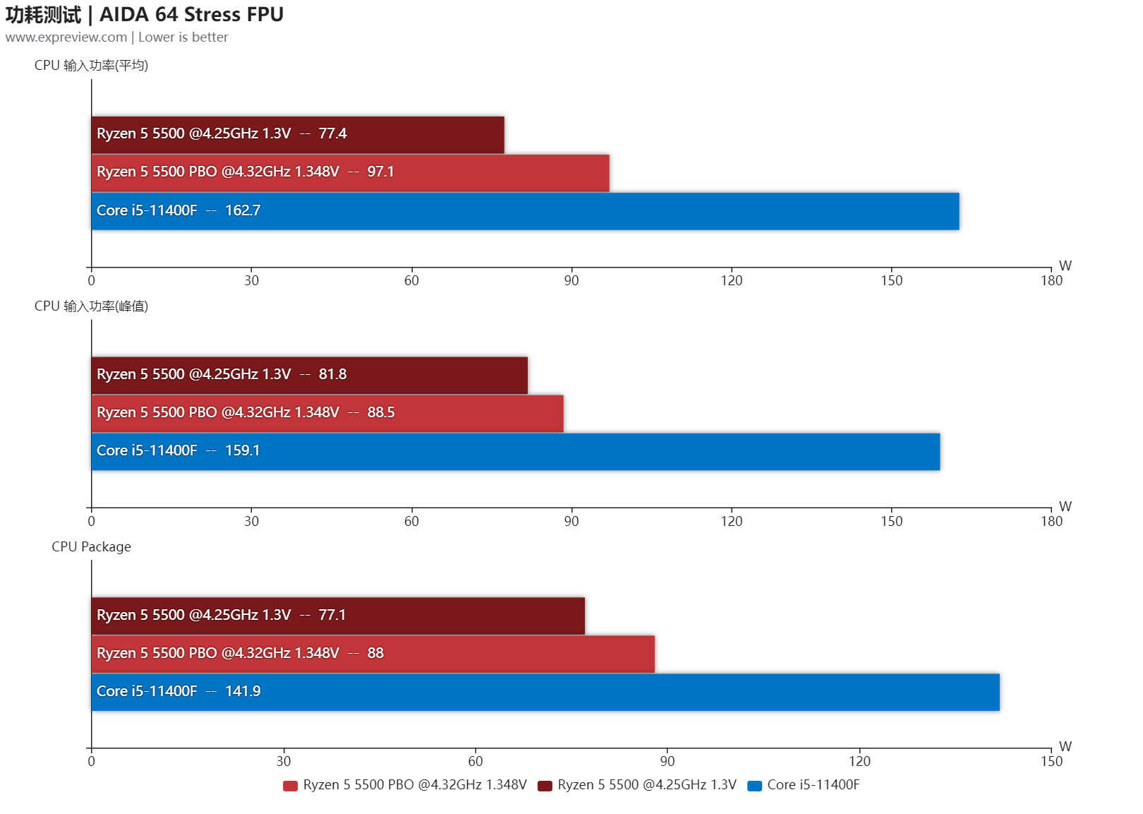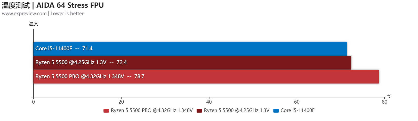 运行AIDA 64 FPU烤机测试时锐龙5 5500的频率就能达到4.25GHz,也就是高压下也能保持最大加速频率,此时CPU Package功耗是77W,开启PBO后烤机频率提升到4.32GHz,功耗增加到88W,频率与功耗提升幅度都不大,温度增幅倒是挺明显的,从72℃涨到了78℃,酷睿i5-11400F在测试时是只用了AVX2保持两者负载一致,但由于用的是较老工艺,功耗达到了141W。