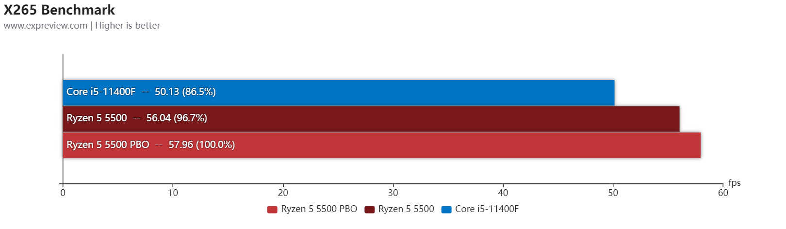 x264以及x265是两个老牌开源编码器,应用相当广泛,这次我们使用了新版本的Benchmark,锐龙5 5500在这两个测试里面表现要比酷睿i5-11400F好不少。