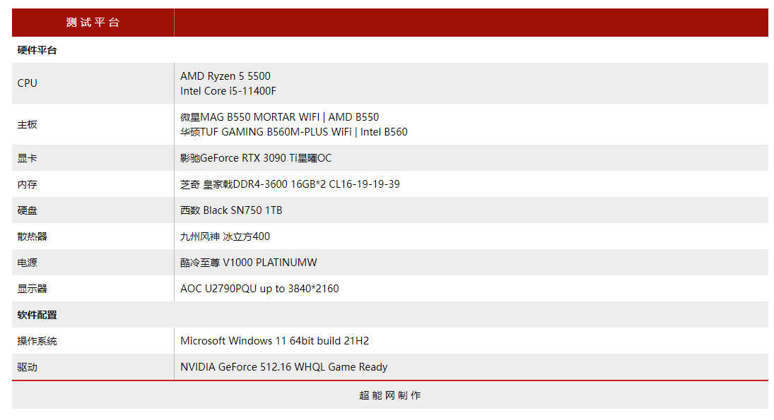 锐龙5 5500的售价只有1099元,Intel那边价格与定位比较接近的是11代的酷睿i5-11400F,我们给锐龙5 5500搭配的是微星MEG MAG B550 MORTAR WIFI 主板,而酷睿i5-11400F则使用华硕TUF GAMING B560M-PLUS WiFi主板,为了避免显卡上的瓶颈,采用了影驰GeForce RTX 3090 Ti星曜OC显卡,两套平台均采用两根16GB的皇家戟DDR4-3600内存,时序是CL16-19-19-39, 由于这两颗处理器发热量都不大,用九州风神冰立方400这种百元级风力就可以了。