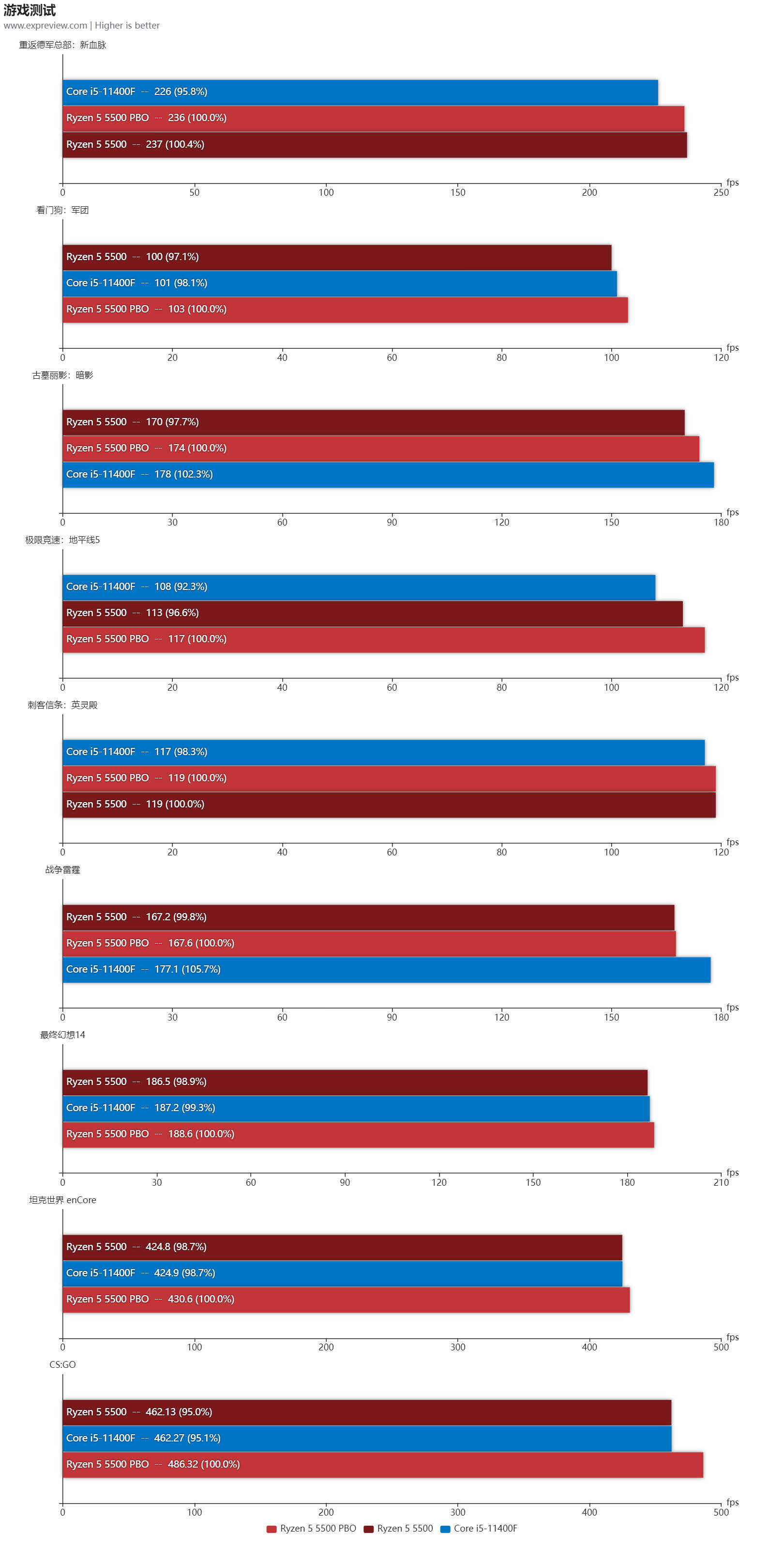 不论单机游戏还是网络游戏,锐龙5 5500和酷睿i5-11400F基本都是互有胜负,部分游戏是锐龙5 5500表现好一点,有些则是酷睿i5-11400F好些,但总体来说没啥本质上的区别,开启PBO会让锐龙5 5500的游戏性能略微有提升,但也不是每个游戏都会有变化。