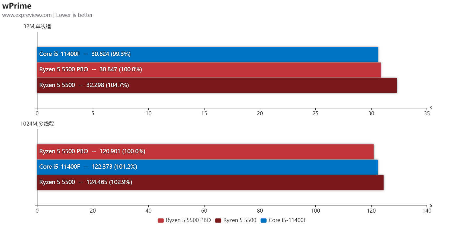 wPrime测试锐龙5 5500默认状态还是要略低于酷睿i5-11400F的,但开启PBO后单线程性能基本打平,多线程则略微快一些。