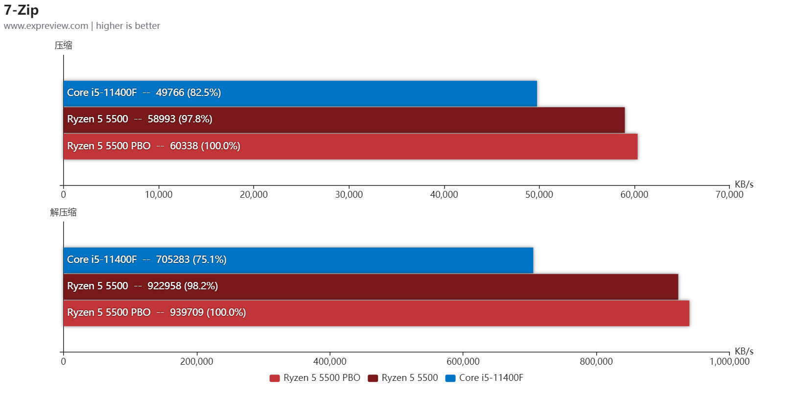 7-zip使用最新版本内置的Benchmark测试,压缩类测试Zen 3架构本来就快,锐龙5 5500默认状态都比酷睿i5-11400F好不少。