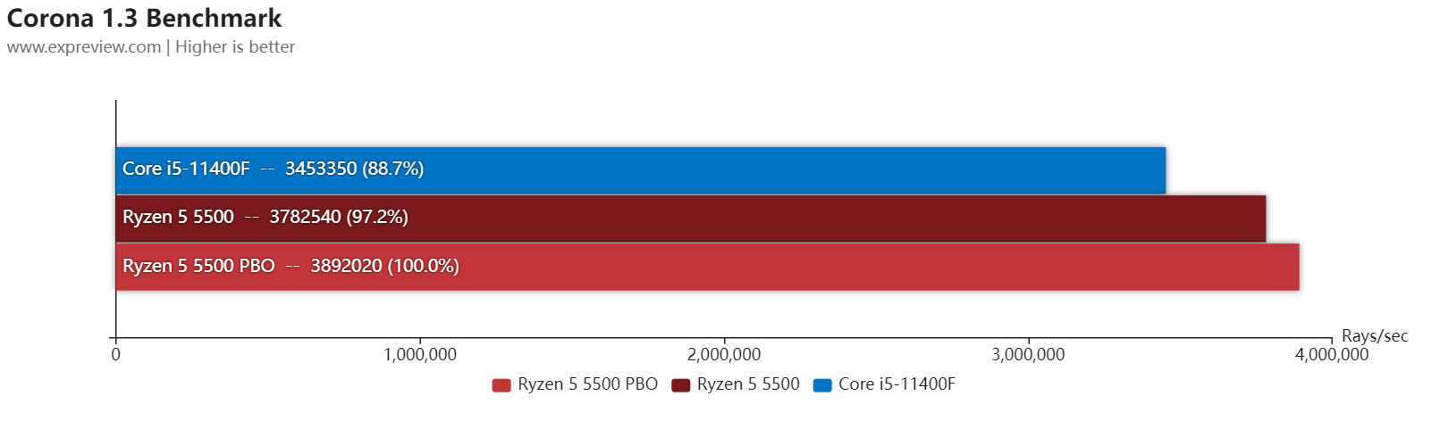 Corona Renderers是一款全新的高性能照片级高真实感渲染器,可以用于3DS Max以及Maxon Cinema 4D等软件中使用,有很高的代表性,这里使用的是它的独立Benchmark。同样的,默认状态下的锐龙5 5500在这里就要优于酷睿i5-11400F。