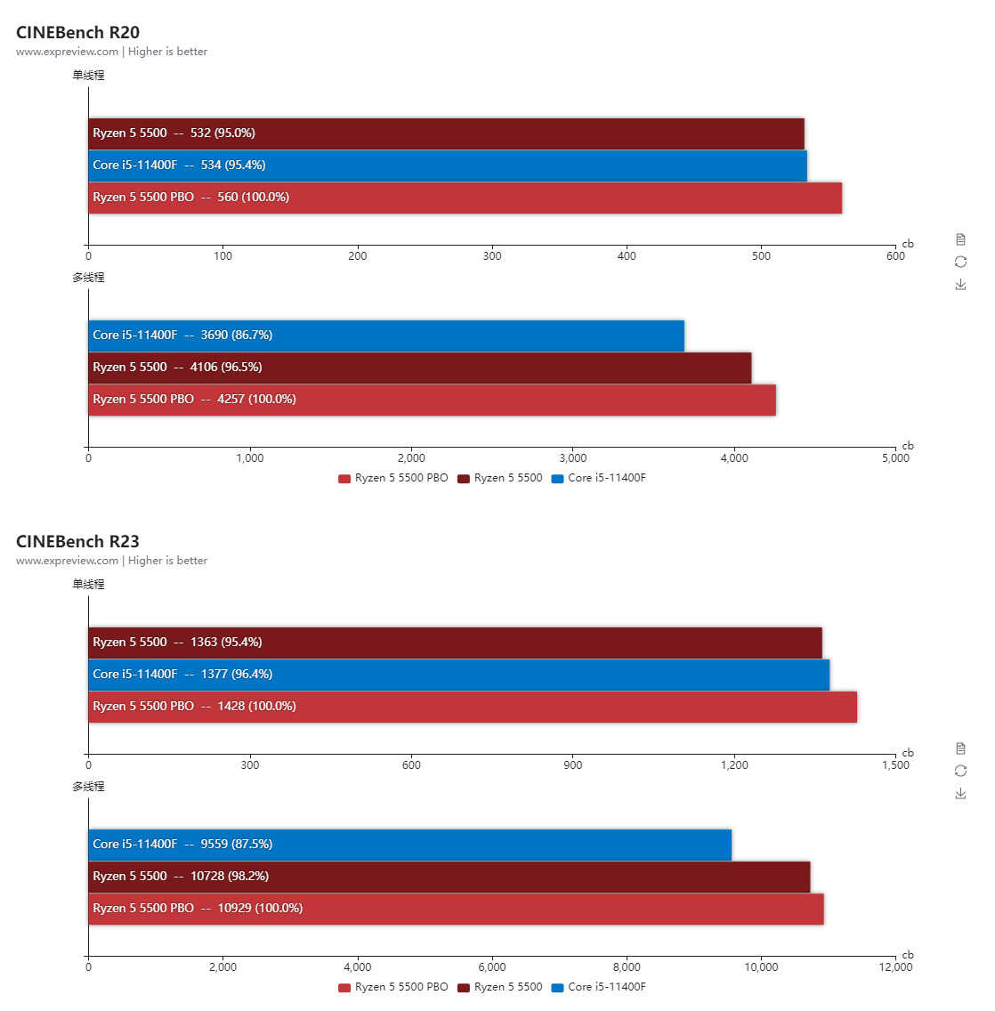 CINEBench使用MAXON公司针对电影电视行业开发的Cinema 4D特效软件的引擎,该软件被全球工作室和制作公司广泛用于3D内容创作,而CINEBench经常被用来测试对象在进行三维设计时的性能,R20与R23的差别其实不算大,主要区别是R20的默认测试是只渲染一次,而R23则是最低渲染10分钟。锐龙5 5500默认状态下多线程是要比酷睿i5-11400F更强的,但单线程得分要低一些,在开启PBO后单线程得分就反超酷睿i5-11400F了。