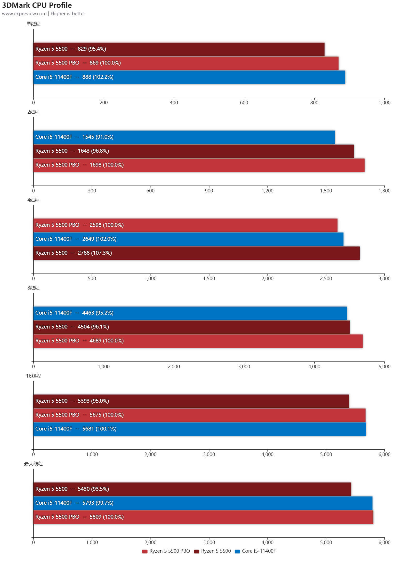 3DMark的CPU Profile测试,默认状态的锐龙5 5500其实在2、4、8线程负载时是比酷睿i5-11400F强一些的,但单线程与最大线程落后,开启PBO后最大线程性能追平。