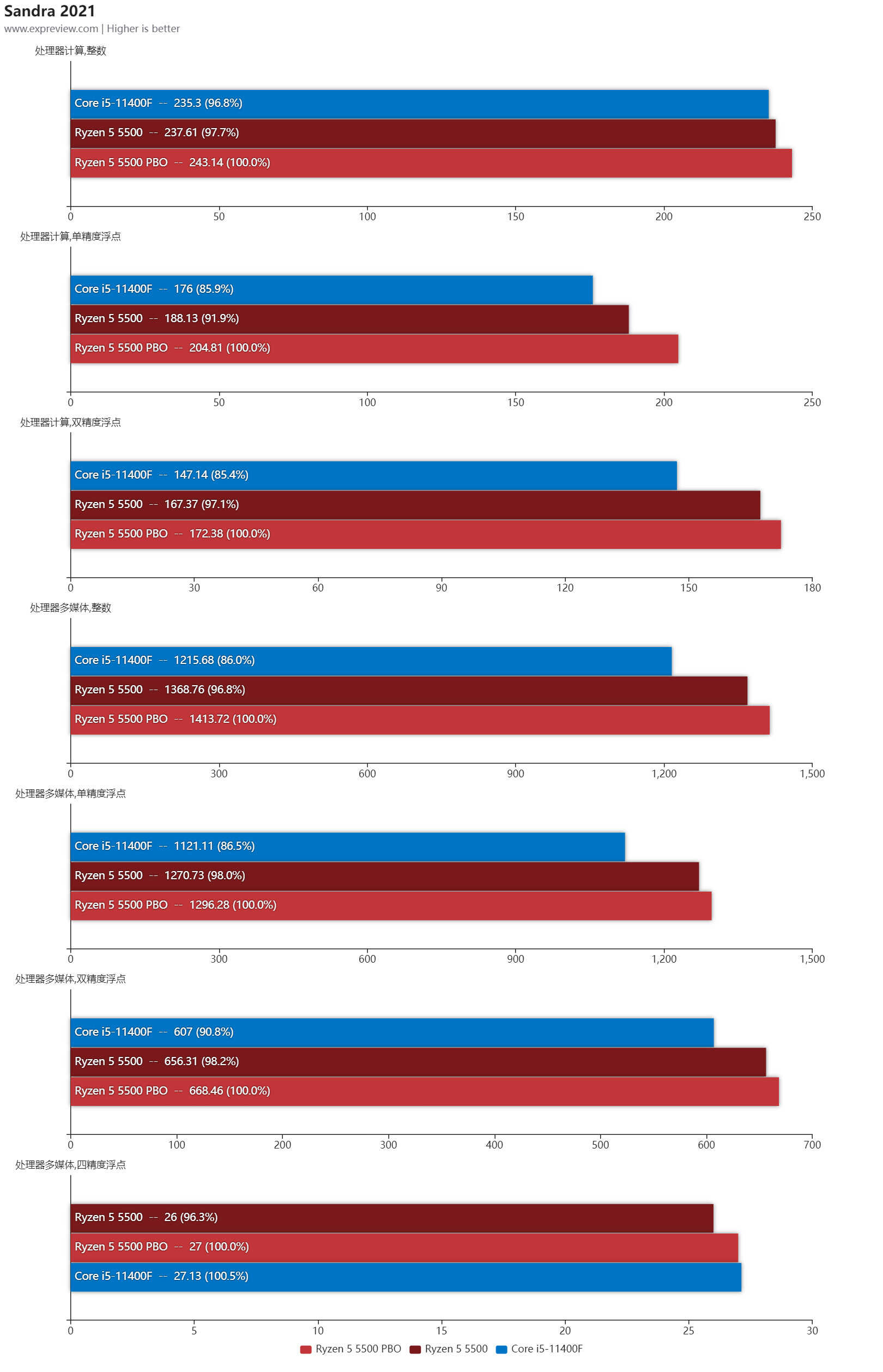 锐龙5 5500不论在Sandra 2021的处理器计算还是处理器多媒体测试中整数以及浮点计算能力基本都是强于酷睿i5-11400F的,而且酷睿i5-11400F的AVX-512在处理器多媒体测试中是有生效的,但依旧不敌锐龙5 5500,而锐龙5 5500在开启PBO后性能有些微提升,但由于频率只是从4.25GHz提升到4.45GHz,幅度有限。