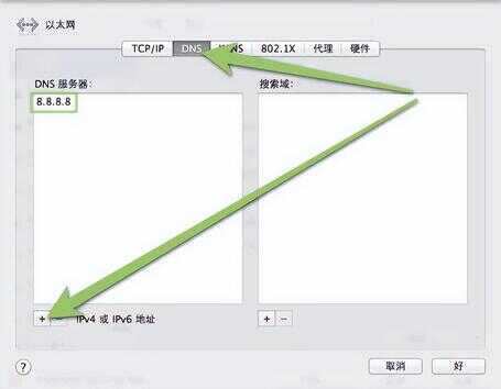 - 在左侧表格下,单击“+”并输入“8.8.8.8”(Google 的公共 DNS)。