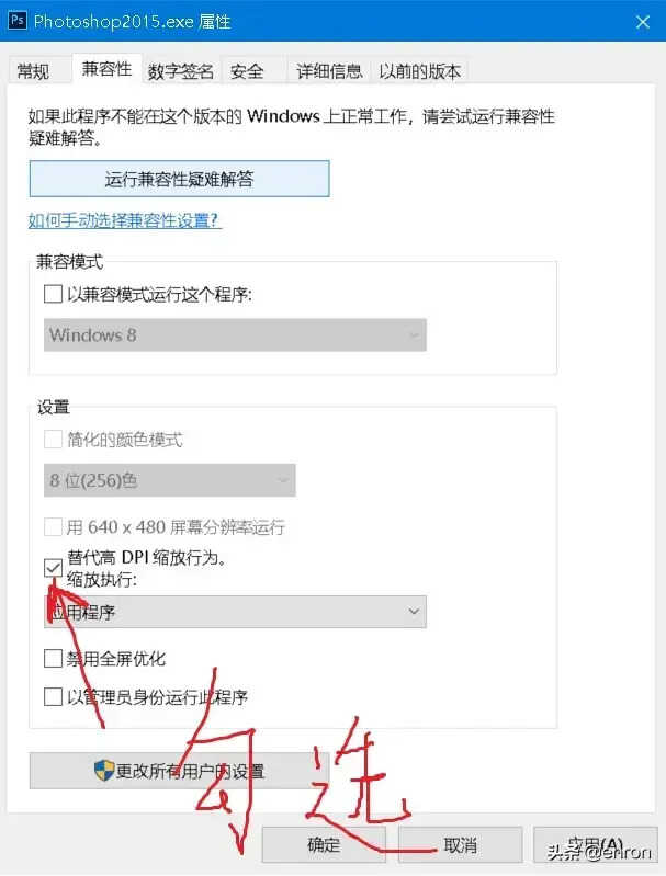 方法1:右键单击PS快捷方式--------点击属性---------选择兼容性---------勾选替代高DPI缩放行为选项如果上述操作出现问题试一下